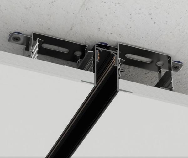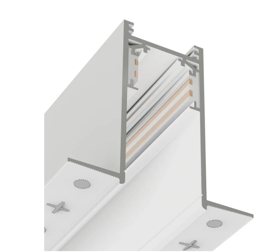 Используется шинопровод для установки в нишу подшивной конструкции из ГКЛ. На время ремонта на установленный трек устанавливается пластиковая защитная заглушка (в комплекте), позволяющая завершить отделочные работы и предотвратить попадание отделочных материалов в канал трека.